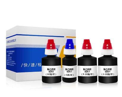 取待检液 1mL 左右于试管中,加 10 滴氟乙酰胺检测试剂 1,再加 5 滴氟乙酰胺检测试剂 2,置沸水中水浴 5min(使其充分水解成氟乙酸钠释放出氨)。取出放冷,加 9 ~ 10 滴氟乙酰胺检测试剂 3(调 pH 值 3 ~ 5)后,加 3 ~ 10 滴氟乙酰胺检测试剂 4(使其与氟乙酸反应),阳性结果为粉红或紫红色,尤其在滴加后的液面上更为明显(检出限可达 50μg/mL)。测定时做空白对照试验,阴性结果为浅黄或黄色,有些空白对照为黄棕色絮状沉淀,静置后上层液变成无色或浅黄色。